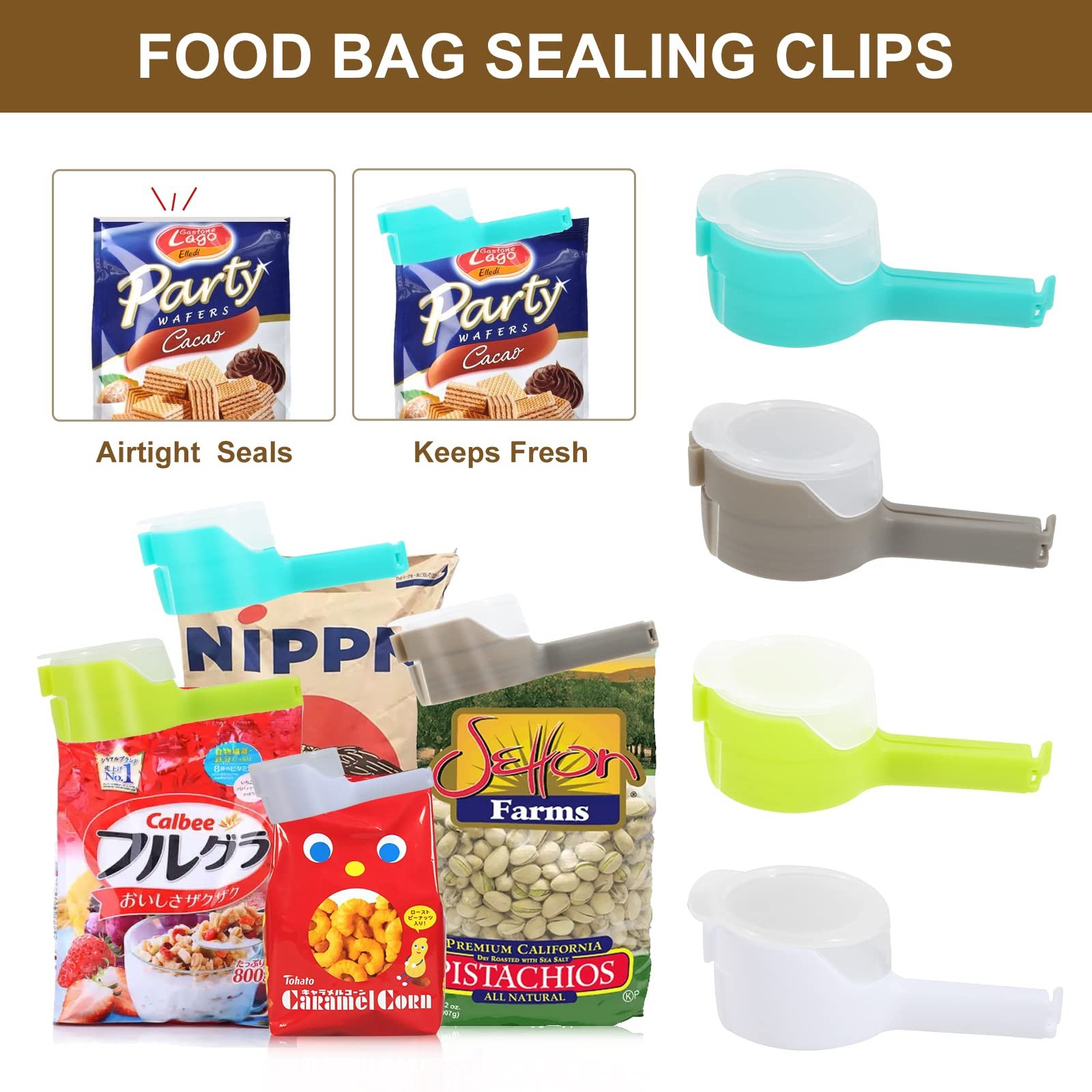 Cara Pakai: Jepit bagian atas kantong makanan yang sudah dibuka untuk menutup rapat sehingga udara luar sulit masuk